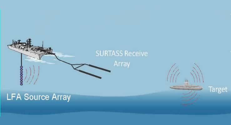 The U.S. Navy Surveillance Towed Array Sensor System (SURTASS) is a low-frequency array of hydrophones that is deployed from surface ships and receives acoustic data. U.S. Navy image / SURTASS LFA sonar program.